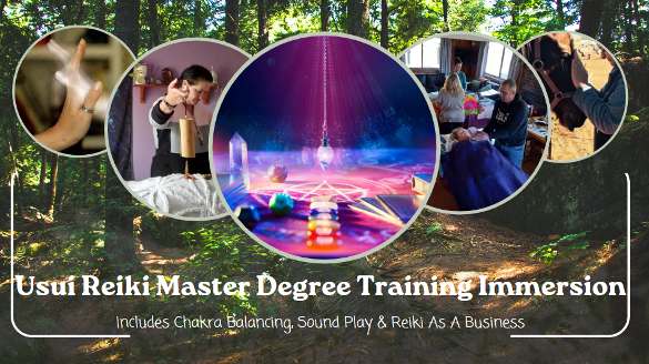 Usui Reiki Master Degree Training and certification including Reiki as a business, packages, chakra balancing, crystal and pendulum work, sound play + business mindset & energy.